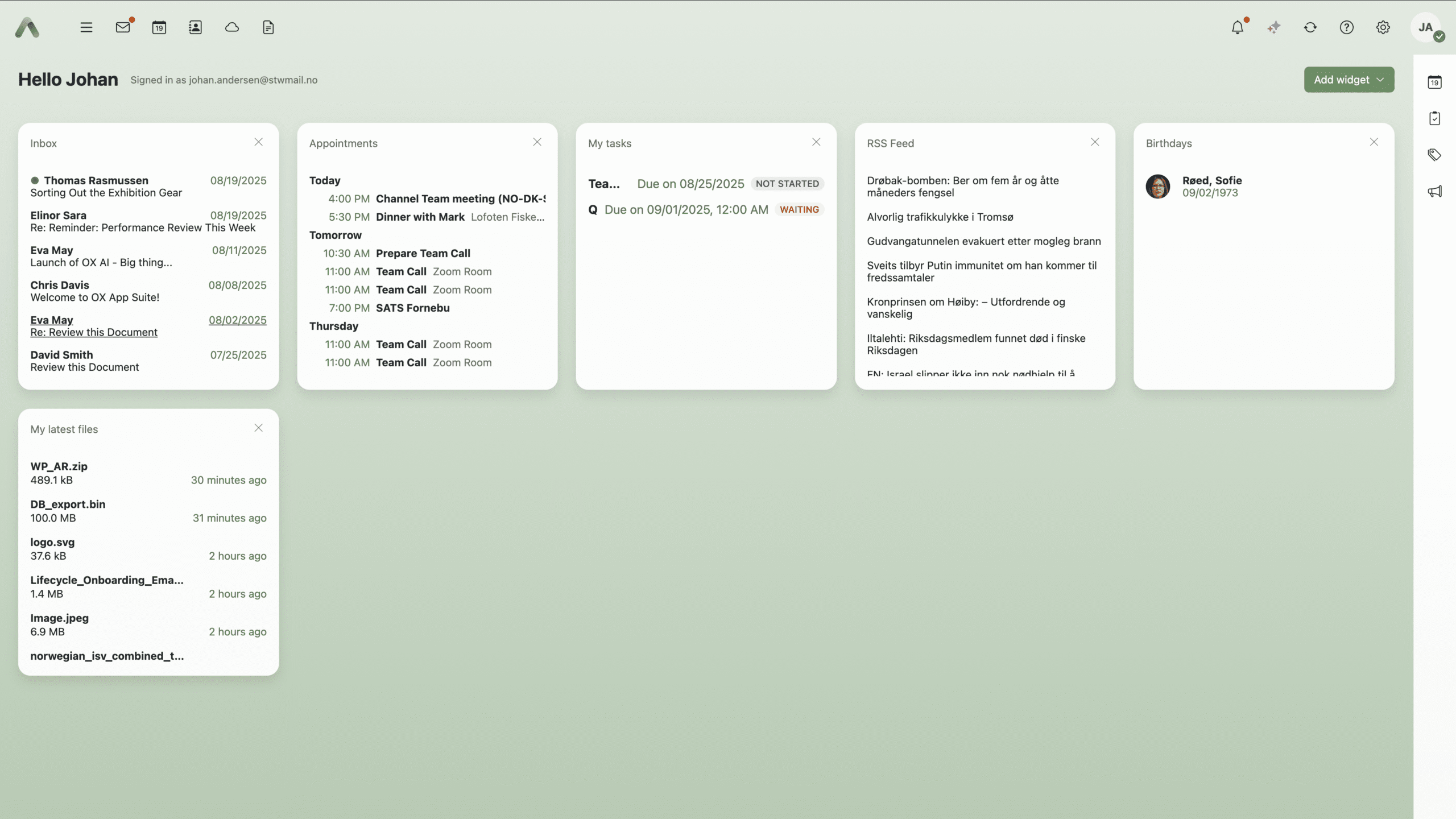 A simple dashboard keeps you up to date with meetings, unread mail, tasks, birthdays, and recent files—all at a glance.