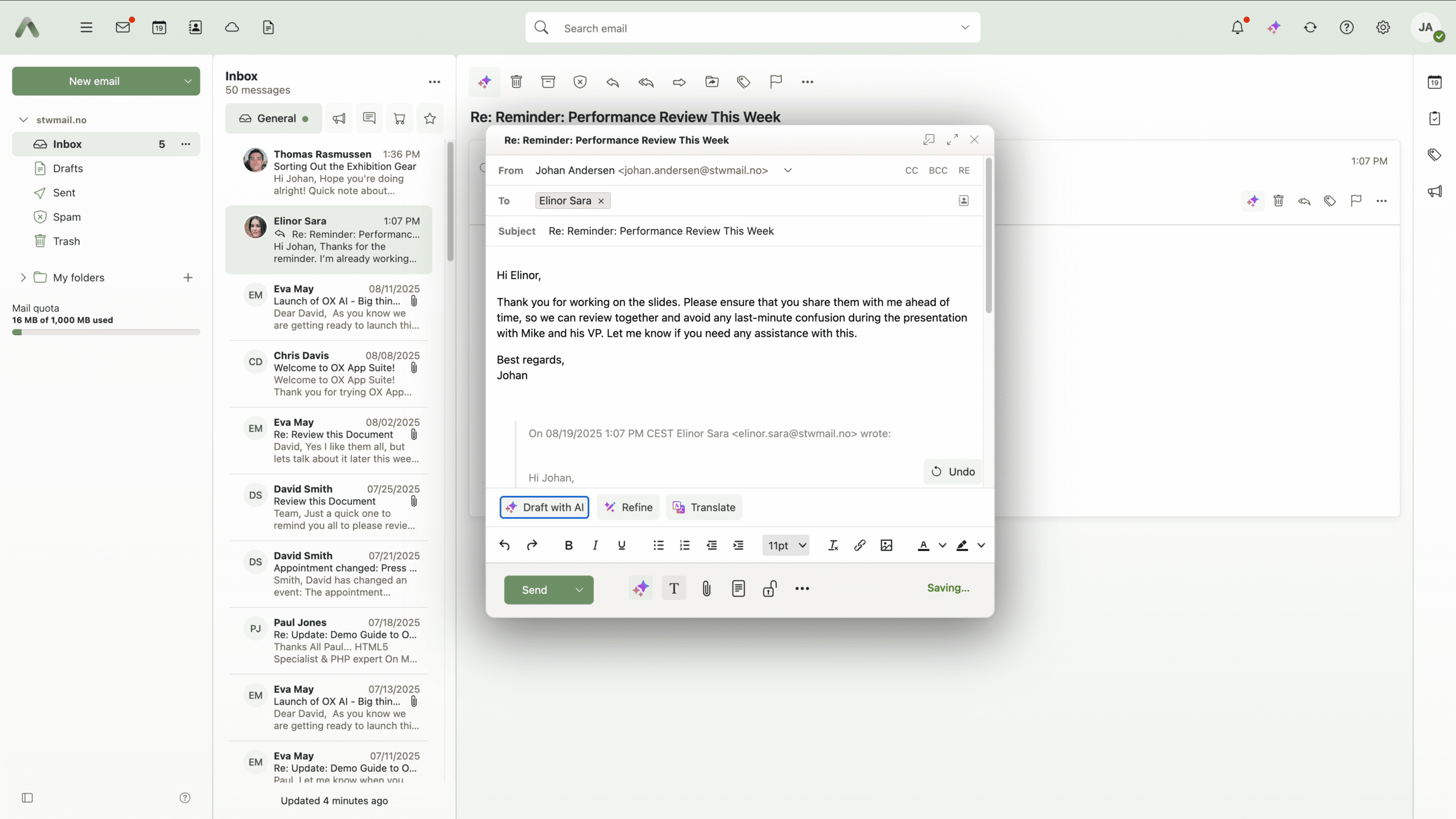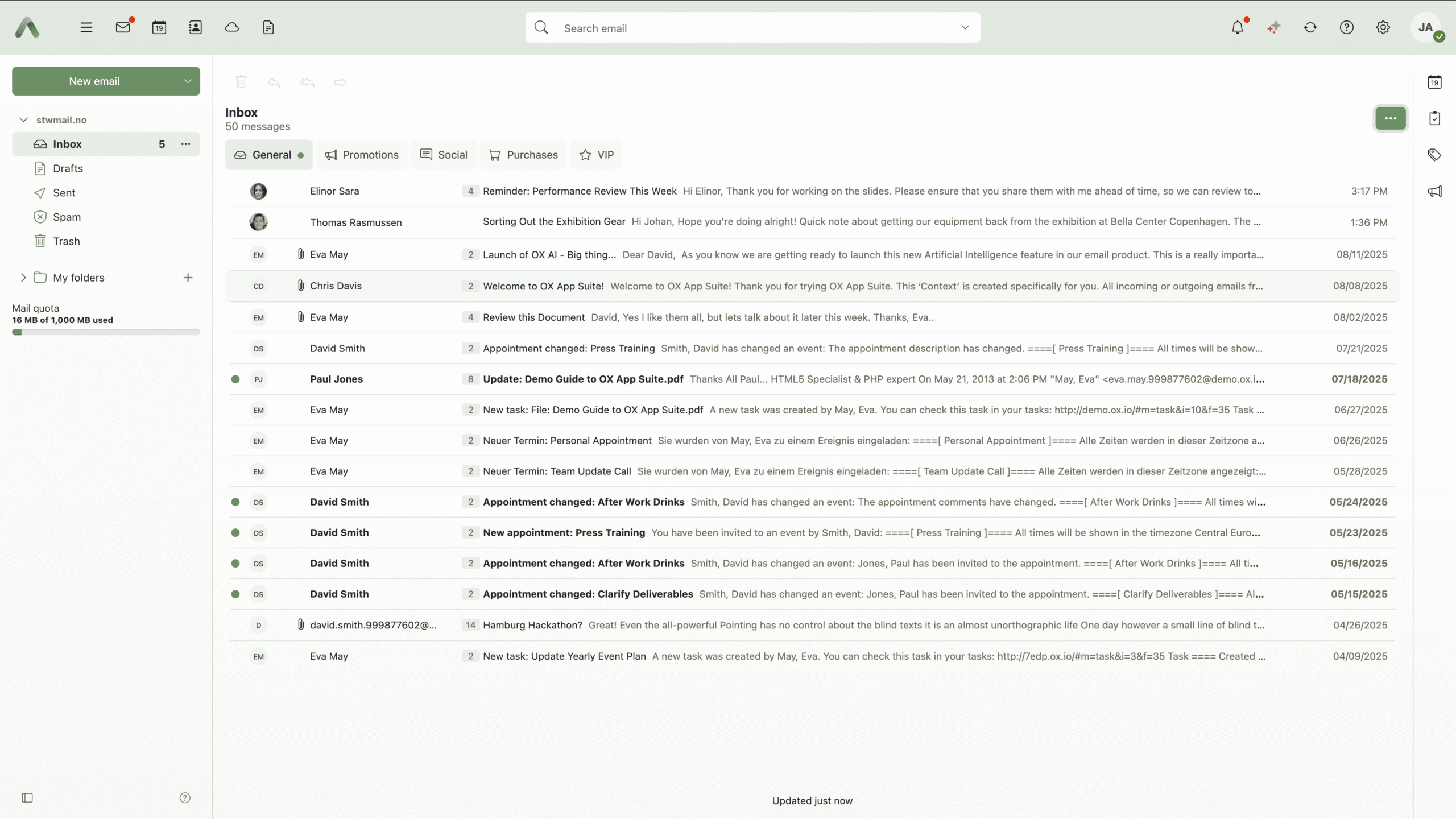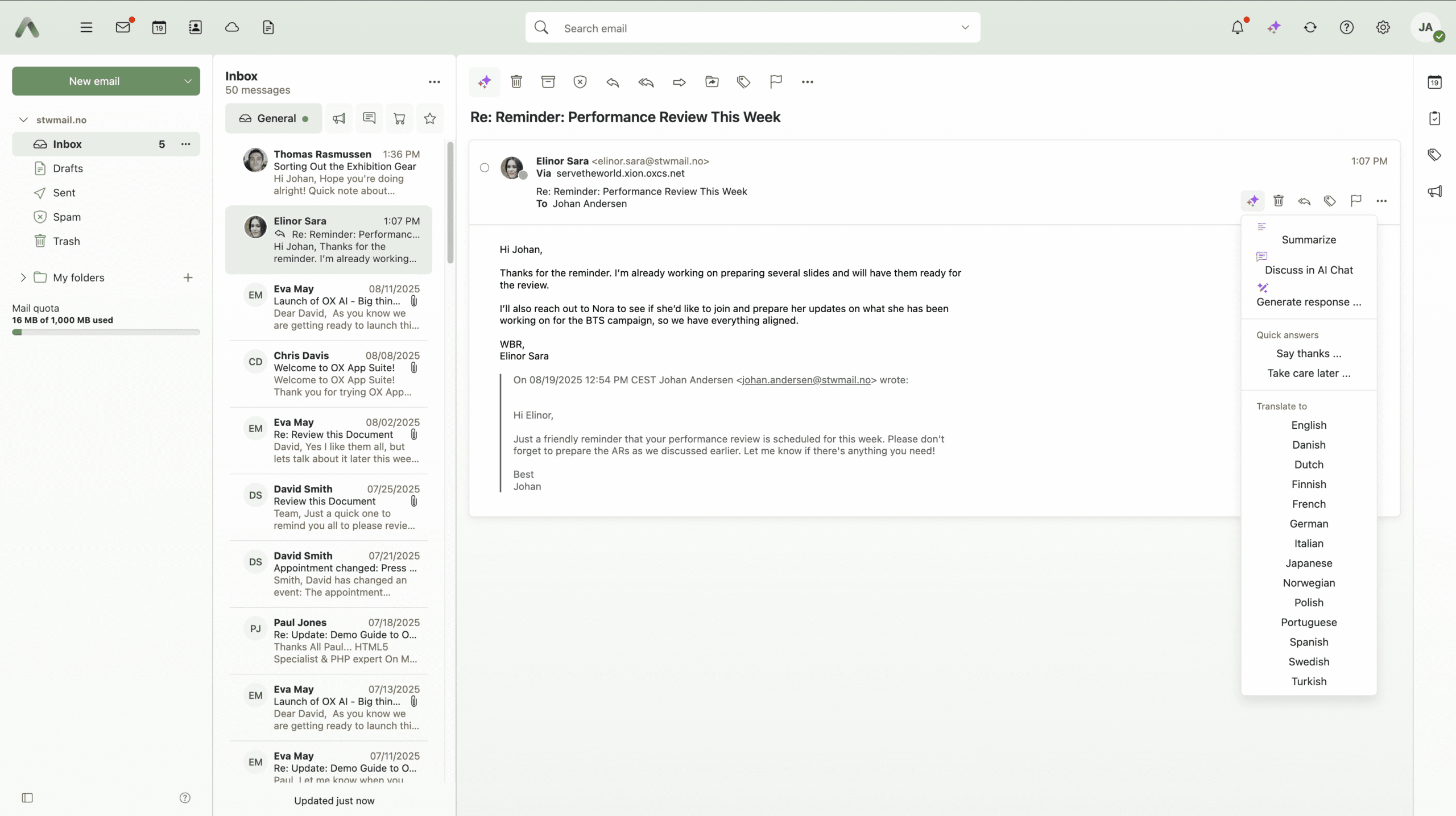 Built on Open-Xchange—Europe’s leading independent email platform—our inbox combines a modern interface with smart folders, instant search, “send later,” and custom rules to keep you organised.