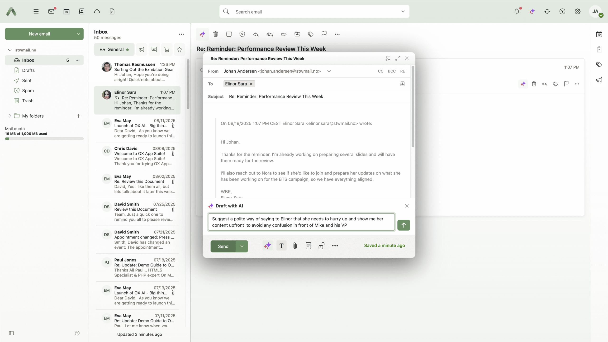 New, optional AI capabilities bring intelligent search and summarization across email, calendar and tasks, and smart reply suggestions, enhancing user productivity and communication efficiency.
