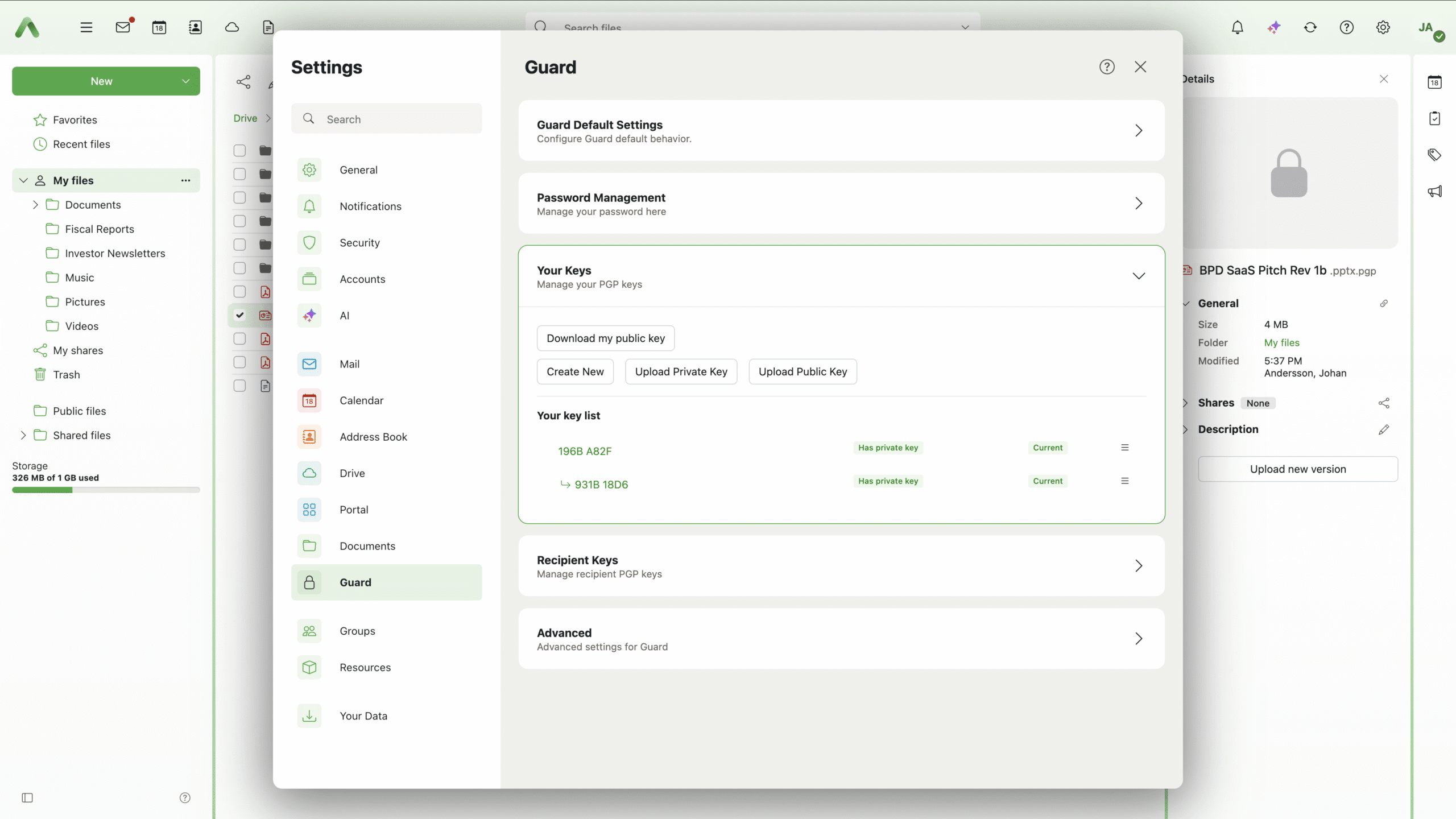 Mailboxes are protected by advanced spam and malware filtering, while two-factor authentication stops unauthorised access even if a password is compromised. All connections use TLS, and for stricter security compliance you can add OX Guard for end-to-end encryption and email signing, with support for your own PGP keys.